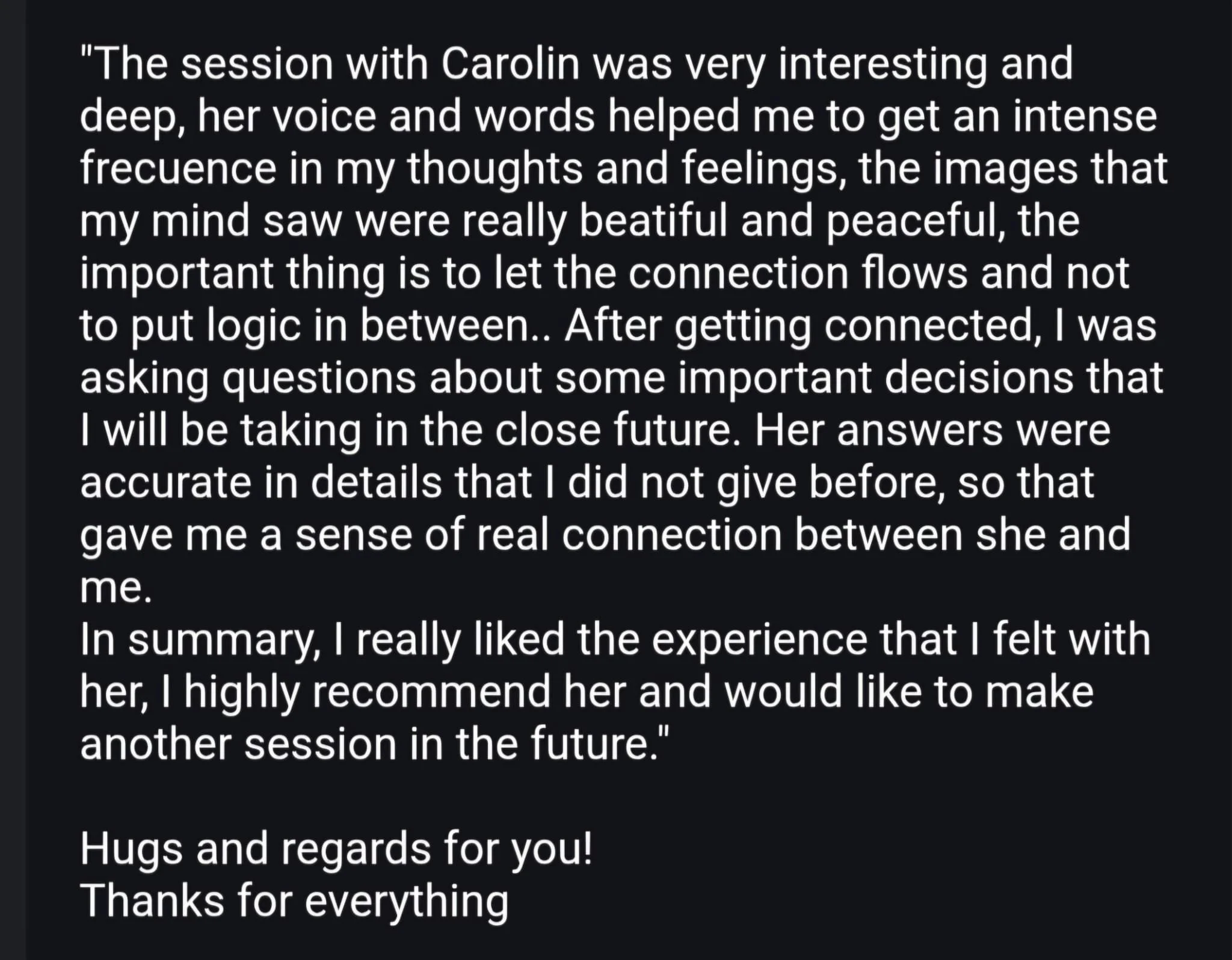 Carolin is such a warm and gentle soul with a truly loving energy. During the reading, I immediately felt at ease and surrounded by kindness. She has a beautiful gift for tuning into the energy around you and sharing messages with deep empathy and sincerity. It was a heartfelt experience that left me feeling peaceful and connected.